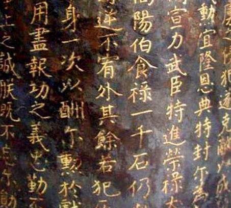 前文我们说到,朱元璋制作铁券,曾经参考了唐朝的钱镠铁券,所以在制作工艺上也是“青出于蓝而胜于蓝”:明朝铁券用铁“质如绿玉”,非同一般,而且上面的字全部用金子制成。