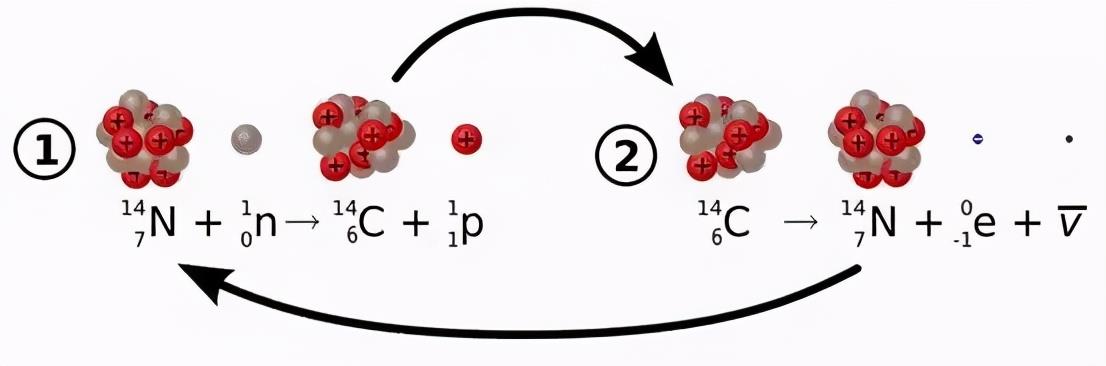 宇宙射线中子撞击掉氮原子中的一个质子产生碳14,并与氧结合成二氧化碳,此过程每时每刻都在发生。
