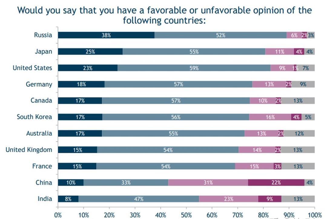 民调结果显示,在十一个大国当中,蒙古国的国民对俄国的好感排第一,日本次之,印度排最后,中国排第十。