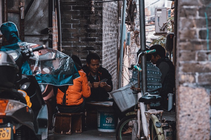 沙井老村位于深圳东塘巷的公园旁,街头剃发的老匠人,还有透过铁丝网钓鱼的耄耋老人,一桌又一桌打牌的男女老少,热闹中带着祥和安逸。