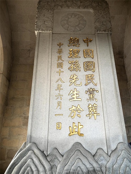 再前进为碑亭,一块高约6米的碑石上刻着“中华民国十八年六月一日中国国民党葬总理孙先生于此”的镏金大字。