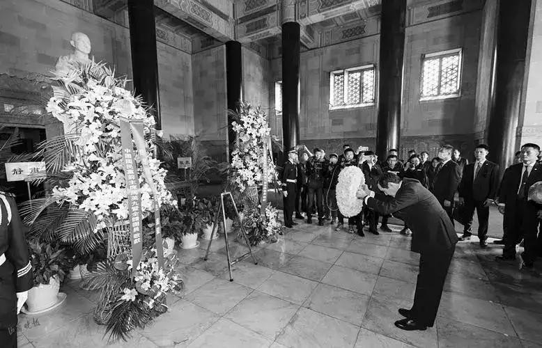 【老照片】张学良敬献花圈,并对雕塑三鞠躬。同时张学良与蒋介石庆祝中原大战的胜利