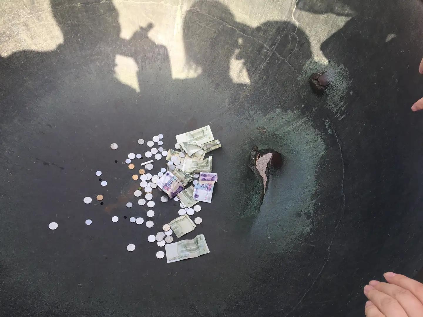 【实拍】铜鼎曾经被撞击在地砖上(女子脚下的地砖是修复过的)的日本流弹弹片弹起后打破一个窟窿