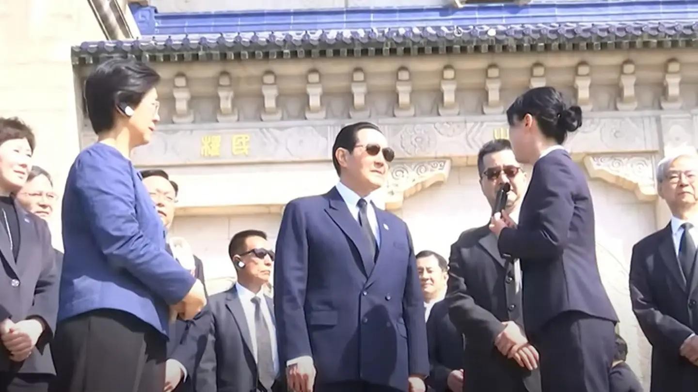马英九在中山陵祭堂前与解说员交流