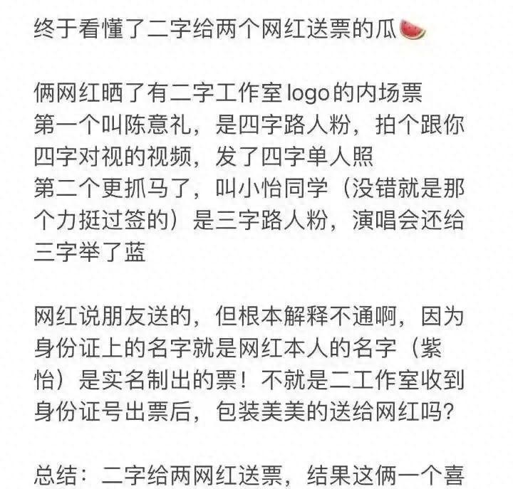 除此之外,一些网络红人也在社交媒体上晒出了他们去看演唱会的门票,然而,粉丝却发现这些门票存在一些疑点。其中,曾卷入吴某凡事件的女网红小怡和陈意礼晒出的门票上竟然带有王源工作室的标志。有人猜测这是否意味着这两位网红获得了王源工作室的赠送,但有趣的是,一位是王俊凯的粉丝,另一位是易烊千玺的粉丝。这引发了粉丝们的好奇和争议,他们纷纷展开讨论,猜测这些门票的来历。