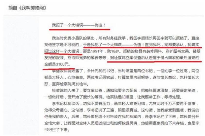 根据郭德纲自传《郭德纲这点事儿》和郭德纲博客《我叫郭德纲》记载,郭德纲在天津红桥文化馆期间,曾经伪造领导签字侵占国家财产,东窗事发之后险些锒铛入狱。