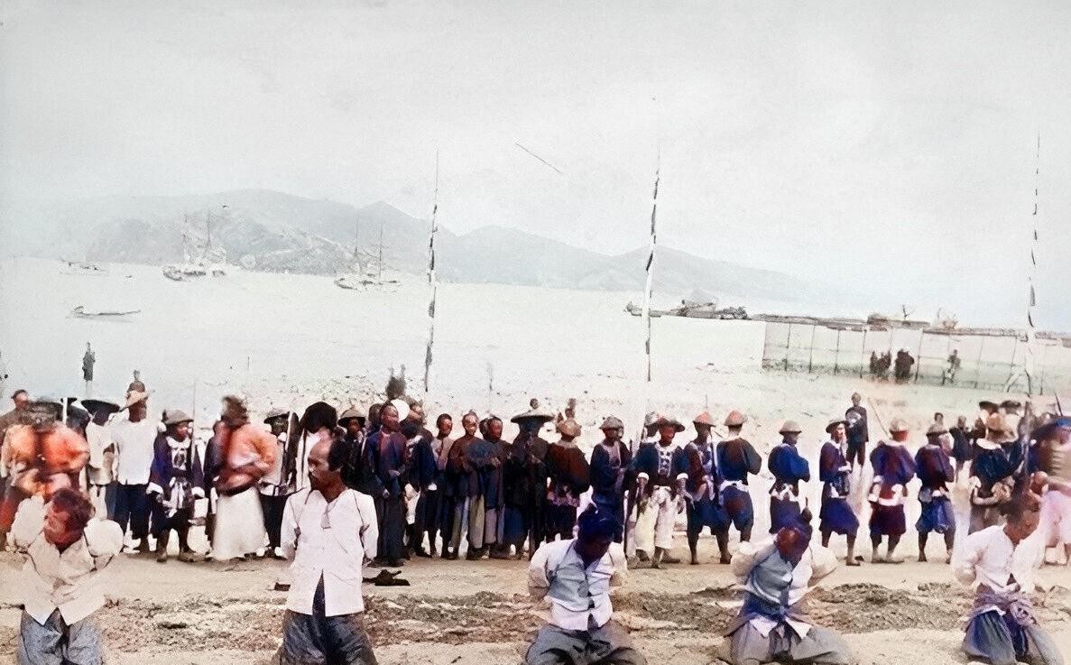 清朝时期,福建。几名日本浪双手被缚,跪在沙滩上。