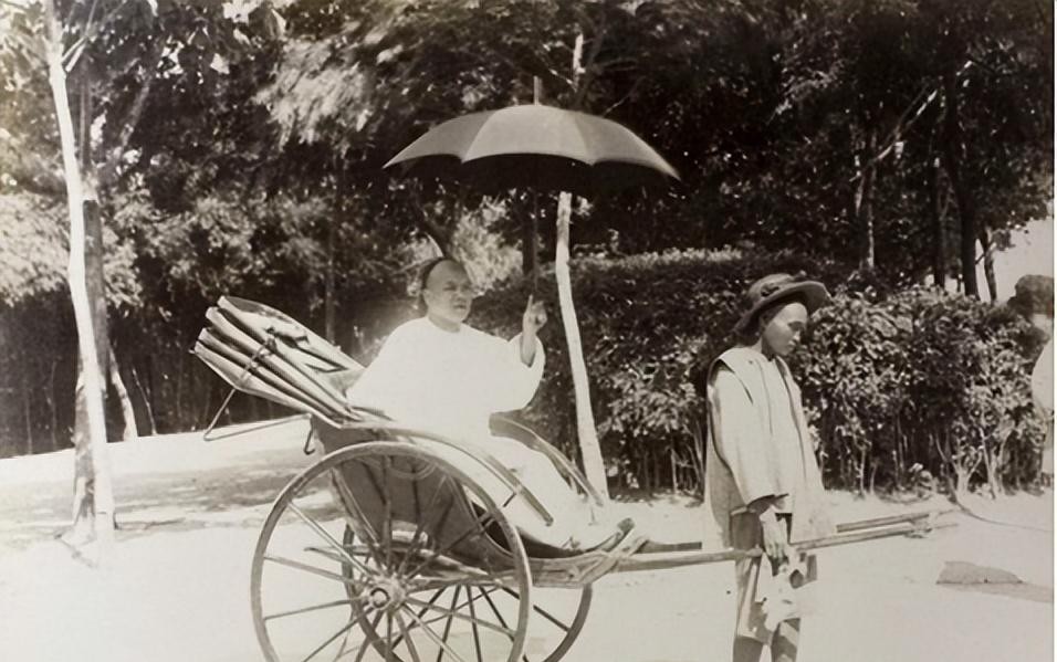 烈日下的人力车夫和客人,一人光脚,一人撑伞。