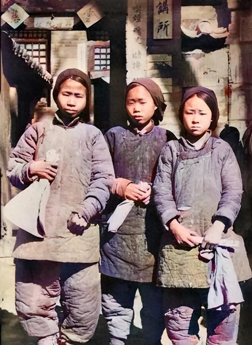 三名头上裹着头巾穿着粗布棉衣的小姑娘表情忧伤地看着镜头