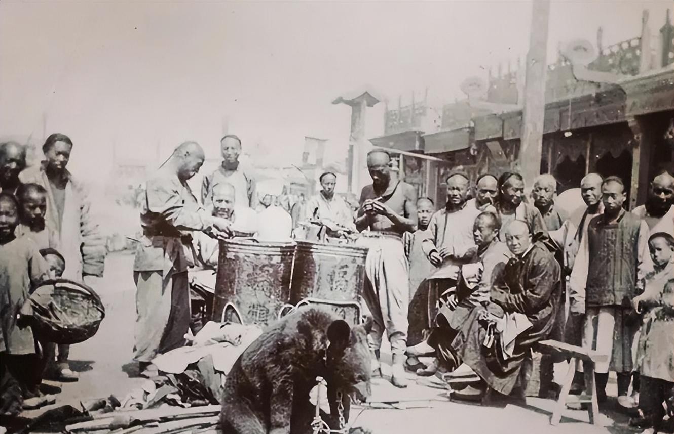 百姓正在围观一头棕熊的表演。