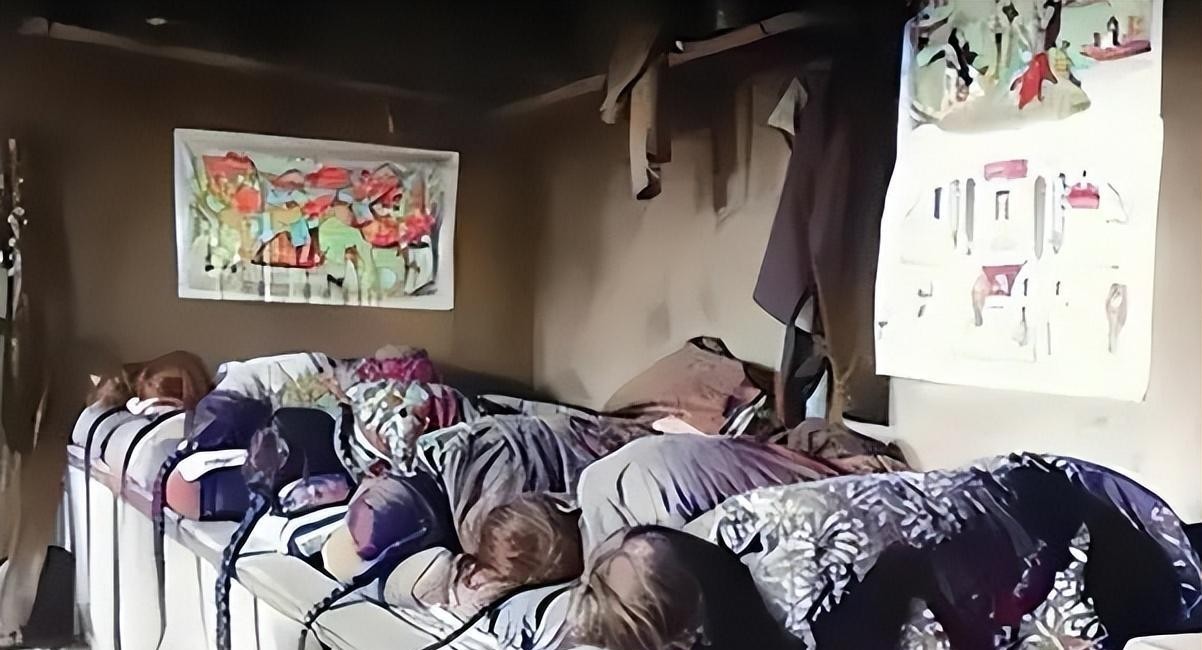 七个人睡在一张大土炕上,墙上挂着年画