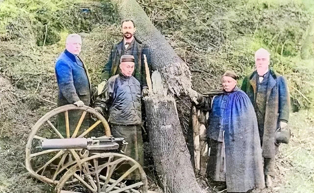 洋人在向晚清外交大臣展示马克沁重机枪的威力,把一棵粗壮的树枝打断了。