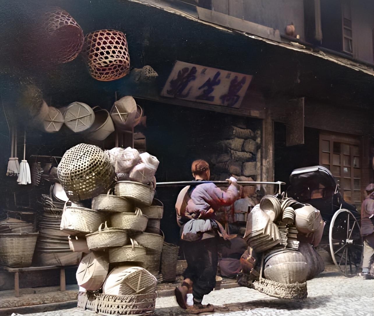 晚清晚期,做买卖的,除了有街边这样的档口,也有挑着担子走街串巷卖东西的