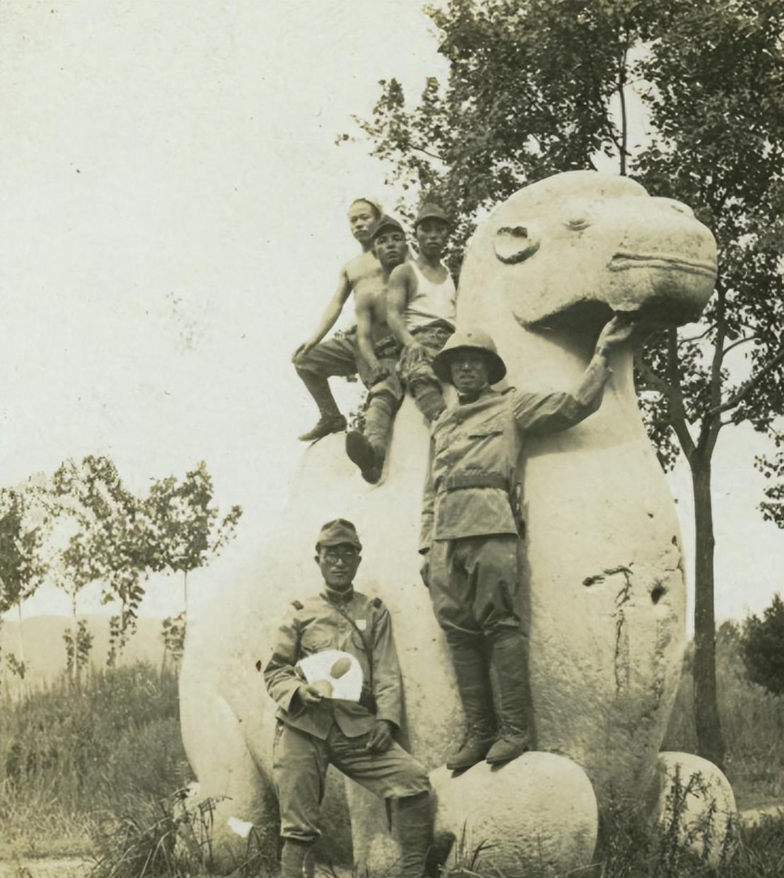 这张照片是日军占领南京后在明孝陵神道石骆驼边的合影。