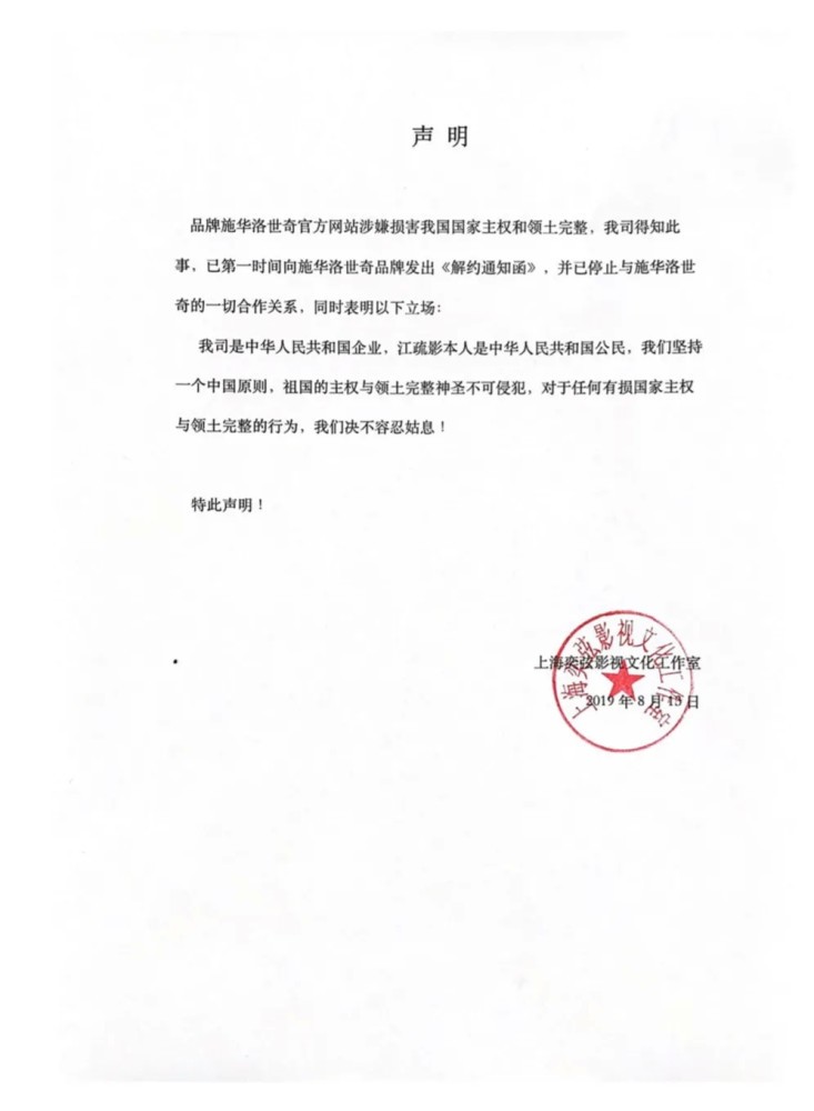 当日,11点02分,江疏影工作室发布声明,称始终坚持一个中国原则,坚决维护国家主权与领土完整,已第一时间向施华洛世奇发出《解约通知函》,并已停止与其一切合作关系。声明还称,任何时刻,祖国主权和领土的完整神圣不可侵犯!