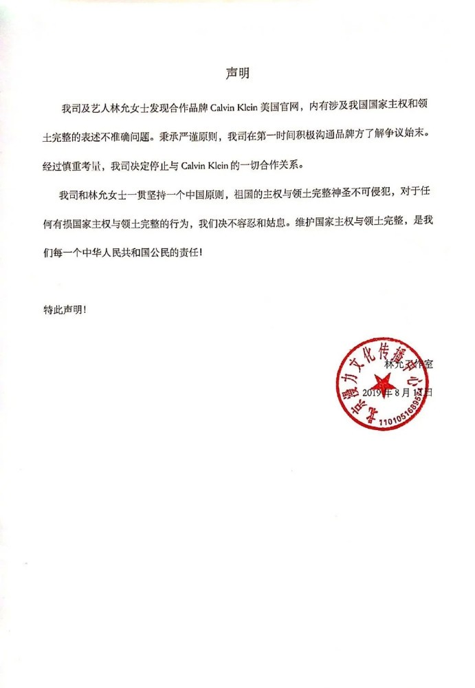 事件爆出后,8月13日,品牌代言人林允发布声明宣布停止与CK的一切合作关系。当时代言人为张艺兴、林允,目前代言人是刘雨昕和张艺兴。
