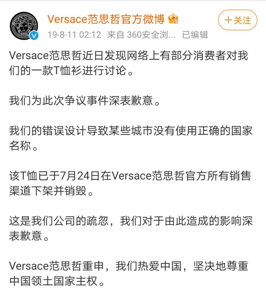在杨幂工作室发文后12分钟,范思哲官方微博发声明致歉,承认T恤的设计有错,导致某些城市没有使用正确的国家名称,而该款T恤已于7月24日从所有官方销售管道下架并销毁。范思哲重申,“我们热爱中国,坚决地尊重中国领土国家主权”。