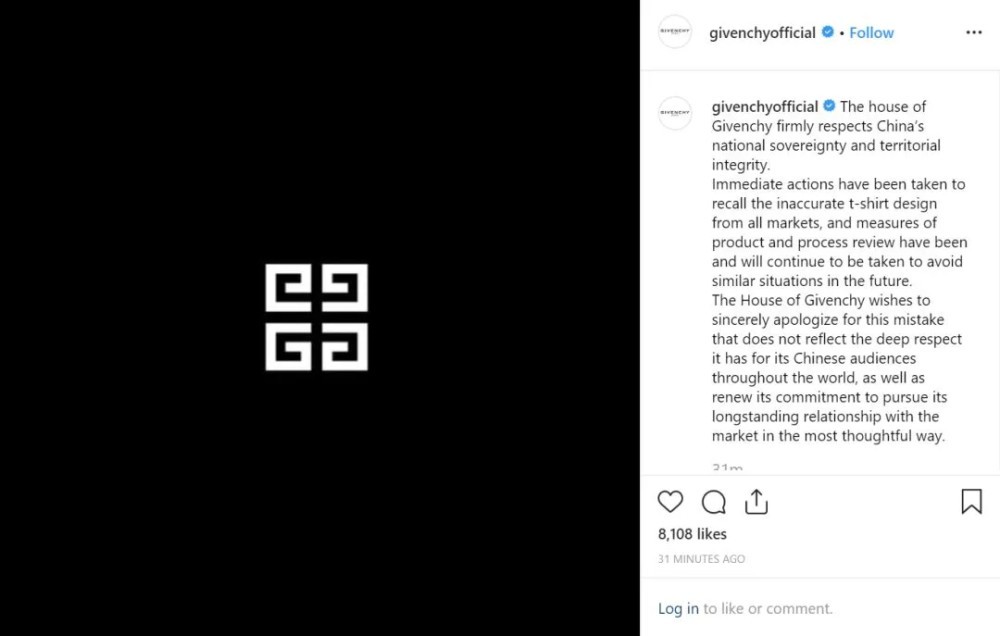 8月12日,纪梵希就产品错误发表声明道歉,称:“关于今日引起部分网友讨论的海外市场纪梵希印花T恤中的错误而引发大家的关注,对此我们深表歉意。对于任何的人为疏忽与错误,我们一定立即纠正并引以为戒。纪梵希品牌一贯尊重中国主权,坚决拥护一个中国原则,坚定不移。”