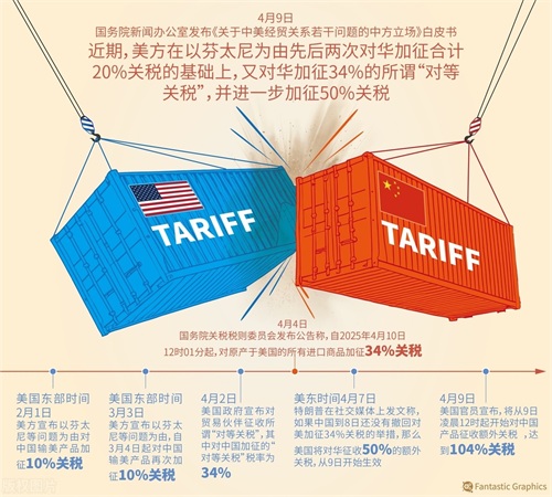 2025年4月,美国白宫宣布,总统唐纳德·特朗普将在4月9日(星期三)起,对中国所有进口商品征收额外84%的关税,令中国输美商品的关税最少达104%,使得全面性的中美贸易战一触即发。