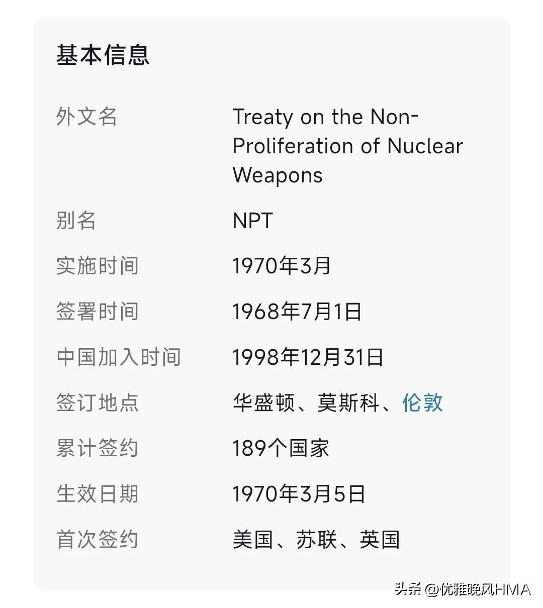 《不扩散核武器条约》是英国、美国、前苏联等59个国家1968年7月1日分别在伦敦、华盛顿和莫斯科签署的一项国际条约。