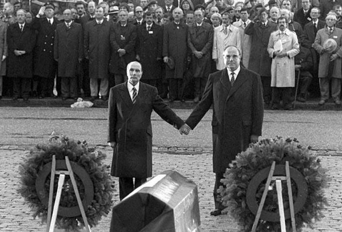 1984年9月22日,时任德国总理科尔和法国总统密特朗,在雨中驱车来到凡尔登,共同为埋葬了德法两国士兵的杜奥蒙公墓揭幕。