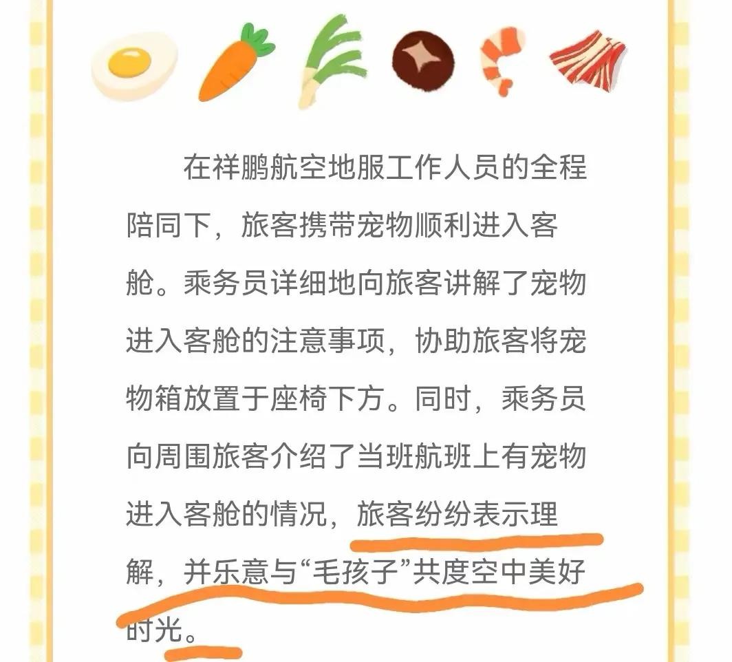 当然,对于这项创新举措,航空公司也做了充分准备和安排,确保了每个乘客的舒适和安全。他们设立了特殊的座位区域,为宠物提供了足够的空间和便利设施。同时,专业的机组人员也在飞行过程中留意着宠物的状态,以确保它们的舒适度和安全性。
