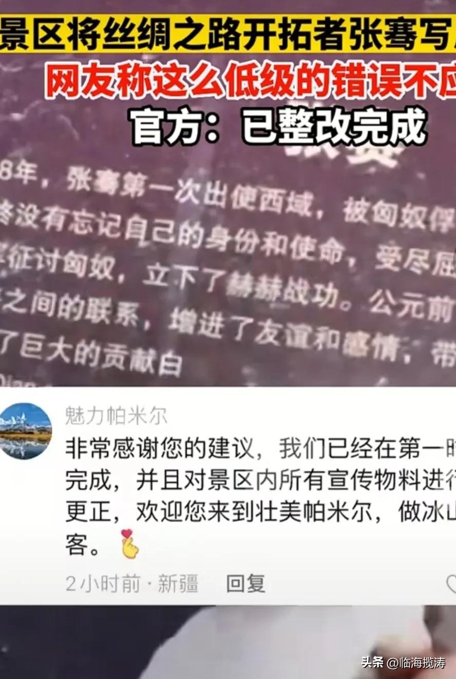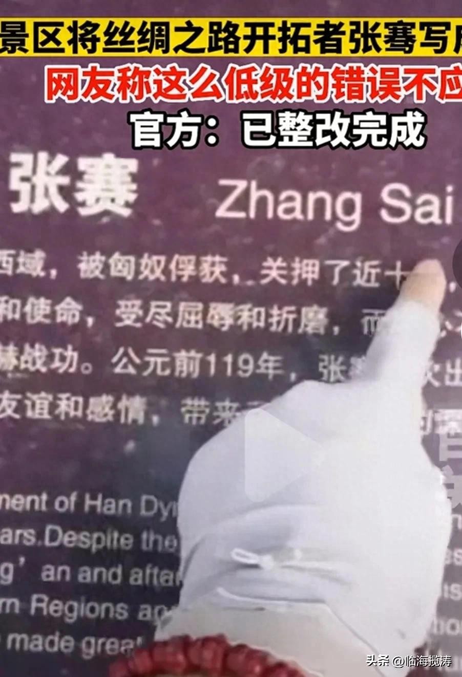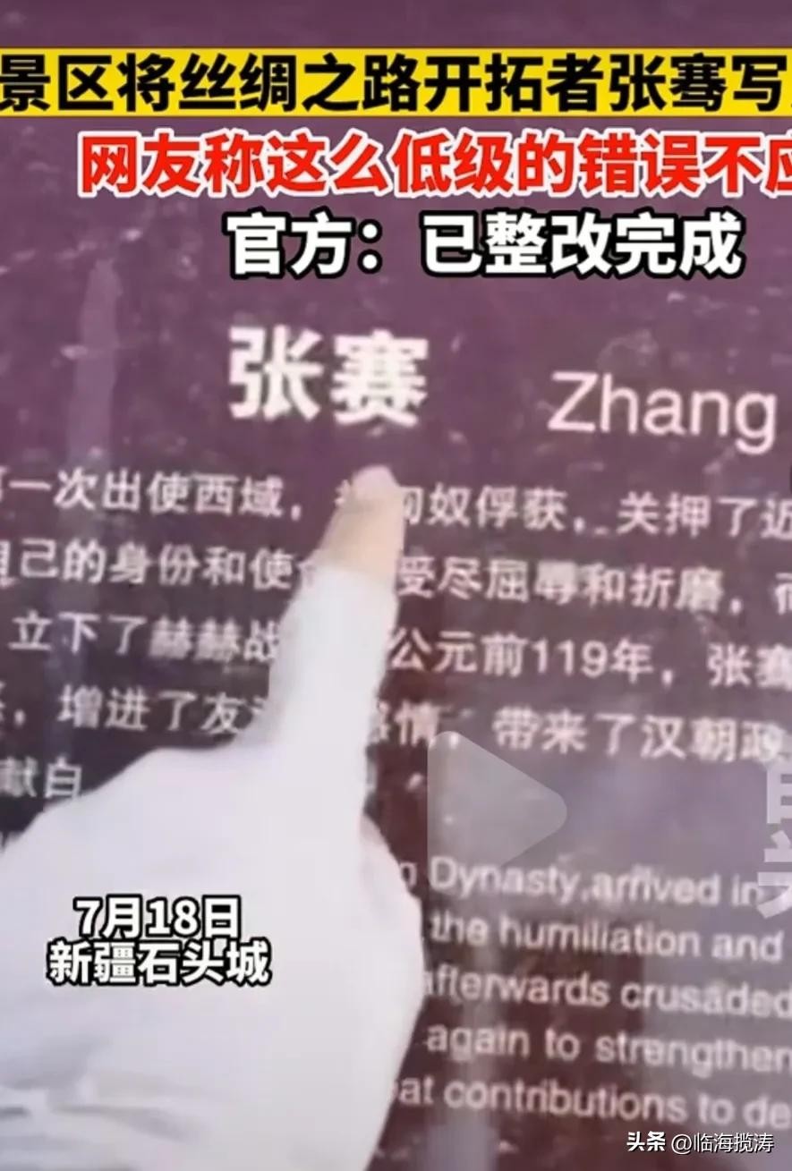 然而就是这位只要接受过基础教育就妇孺皆知的人物,却在某个景区闹出了笑话!7月18日,新疆石头城景区,其介绍景点的花岗岩标志牌,将这位在历史上有着卓越功勋的历史人物,直接改名为张赛,甚至其标注的汉语拼音也直接标识为Zhang Sai 。不知道这位历史人物是否在天有灵,看到这样肆意的为其改名,会不会气的从棺材里跳出来给这景区管理者和开发者两个大耳贴子?