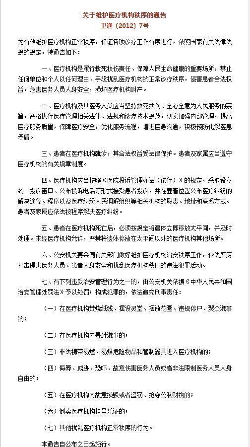 2012年4月30日,卫生部、公安部联合发出《关于维护医疗机构秩序的通告》,明确警方将依据《治安管理处罚法》,对医闹等予以处罚,乃至追究刑责。