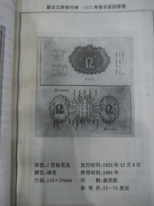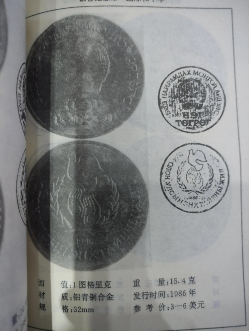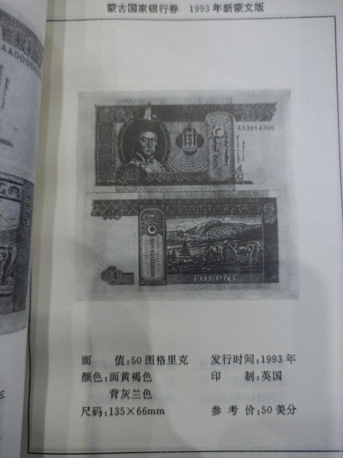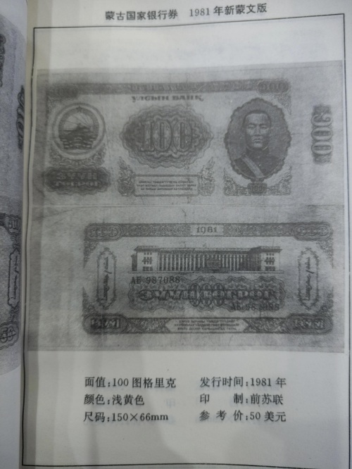 本书是专门介绍蒙古国近代货币(1921年脱离中国独立以后发行的货币)的专集,书名由文史学者、收藏家王贵忱先生题字,对每张钱币标注了面额,发行时间,尺寸、停用时间以及参考价,以美元为单位。因为本书发行时间距今已经有30年了,参考价已经意义不大,作为参考可以大概了解此种钱币的珍稀程度。