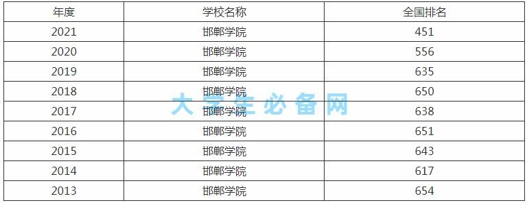 作为考生,是关注的是大学在全国的排位怎么样,邯郸学院在历年全国排名【校友会版】中,2019年排名635位,2020年排名556位,2021年排名451位,可以看到位次逐年呈上升阶段。