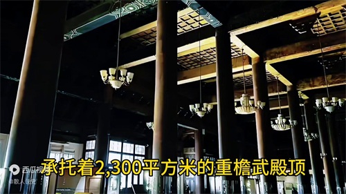 长陵灵恩殿建筑在汉白玉雕刻合城的三层台阶下,金砖铺地,店面阔9间,进深5间,象征着皇帝九五至尊。殿内有60根一米多直径十几米高的金丝楠木大柱,承托着2300平方米的重檐武殿顶,雄伟壮观,举世无双势。