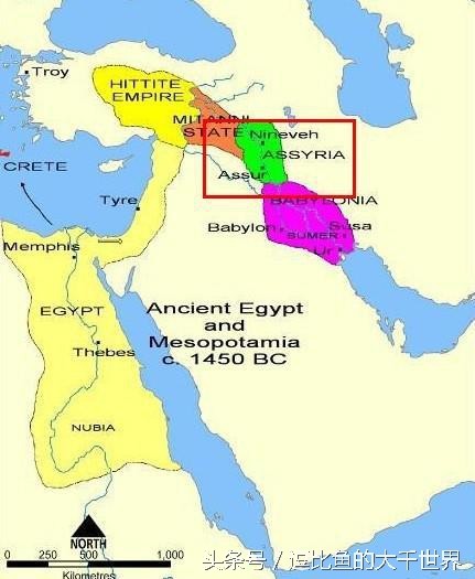 中亚述帝国:公元前1392—公元前1056年,古亚述帝国。(土黄色的是就是中亚述帝国Assyria,一共出现了27个国王,这一时期亚述帝国人口约有100万左右,已经是该时期全世界人口排名前五位的国家)