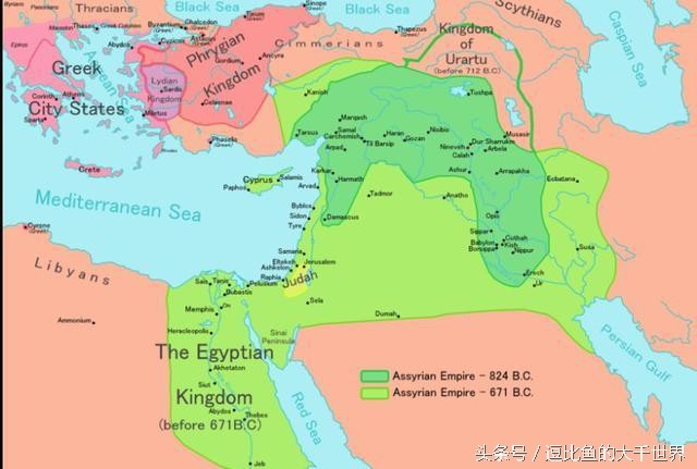 新亚述帝国:公元前911—公元前605年。在公元前824年的时候,亚述帝国还是深绿色的,待到公元前671年,已经成了大片浅绿色。(这时期,一共出现过19位国王,征服了埃及第25王朝和埃兰王国,总共人口攀至世界第一,成为一个7近700万人口的帝国。根据《世界人口历史图集》可以看到,这个阶段正是中国从商朝转至周朝包含春秋时期,人口约为500万左右。)
