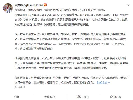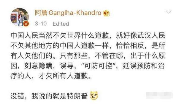 为此,詹青云不得不于3月14号凌晨在微博上致歉称自己表达欠考虑,无意针对此次疫情抖“机灵”。