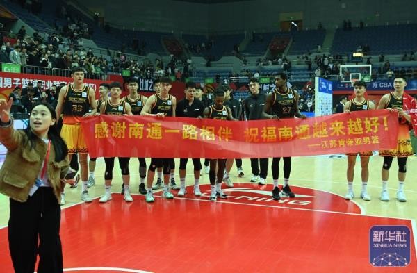 ↑3月30日,江苏肯帝亚队球员赛后持横幅感谢南通主场的球迷。