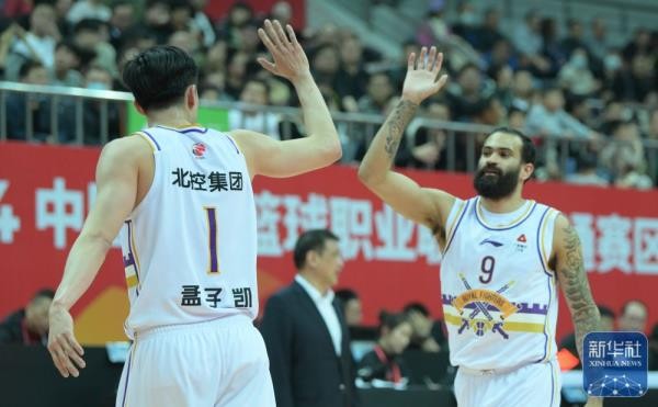↑3月30日,北京控股队球员孟子凯(左)与里勒在比赛中庆贺胜利。