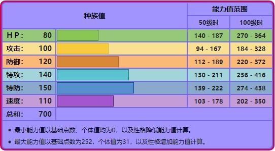 注:技能参照第七世代游戏技能表。技能里粗体字的招式为具有属性一致加成效果的招式。招式教学是可以通过招式教学习得。