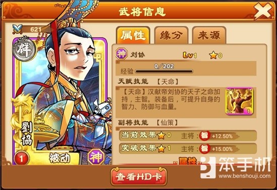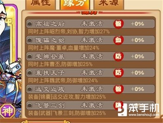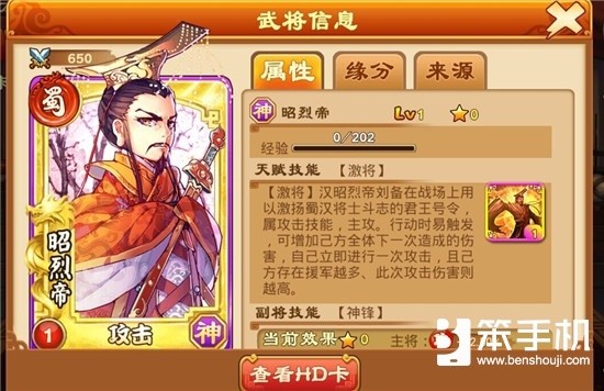 昭烈帝的天赋技能【激将】也是神吕蒙臣服表里有的,这三个属性我算了一下,弱一点,缘分加成也弱了点,比不上五虎缘分也比不上魏武铁骑。