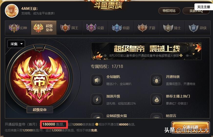 超级皇帝是斗鱼的一种头衔,也是目前为止能够开通的最高级别的头衔,开通一个月需要18万鱼翅,也是18万的真金白银,除了平台做活动,工会刷流水之外,很少见到哪个单人会因此开通超级皇帝,不得不佩服这位神豪真是壕无人性啊。