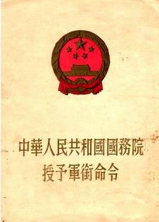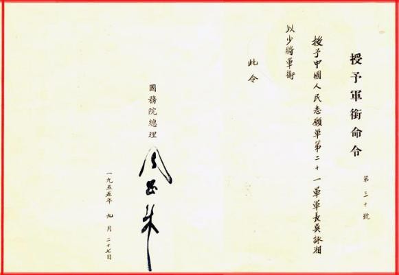 周恩来总理授予志愿军第二十一军军长吴咏湘少将军衔的命令