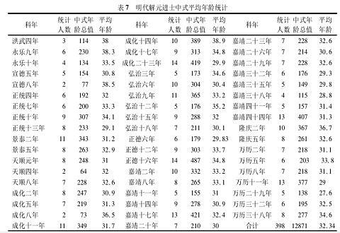 依此计,明代解元进士在相应时段的实际平均中式年龄则分别应该是 32.92 岁、34.93岁和37.06 岁。