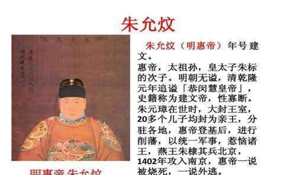 朱允炆本领十分出色,而且能文能武,动作朱元璋的长孙,朱允炆由于聪明还有着仁心,深受朱元璋的欣喜,以至提出要将位子传给他,然而是这个举措成激忿了他的叔叔们。个中以势力丰富的朱棣戴头,直交起卒夺位,然而是在之后却不创造朱允炆的所有踪影。