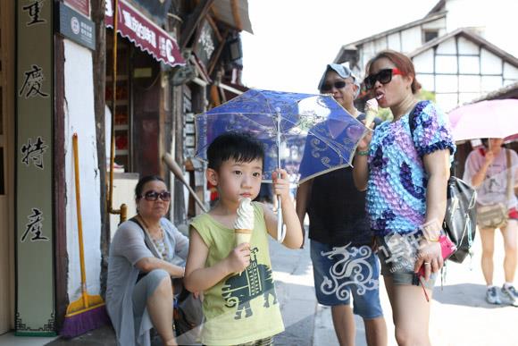 小朋友在磁器口古镇街头游览。记者 石涛 摄