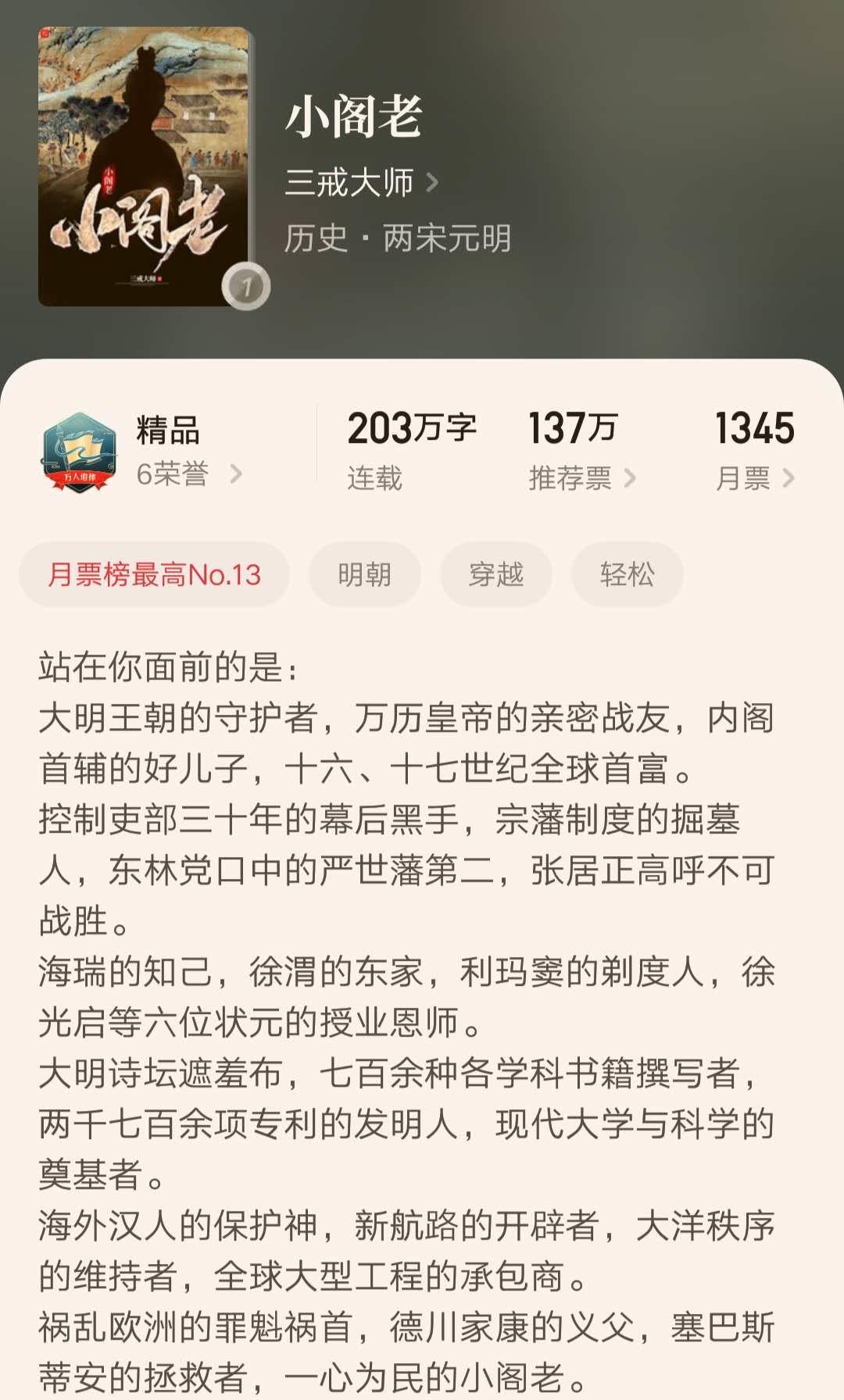 小说讲述了穿越到富农家庭的少年,从小农插队到建立自己的强大势力,在没落大明朝翻云覆雨的故事。具体细节小编昨日更新的文章里有详细的推荐,有兴趣的书友可以关注我,移步去瞅瞅。