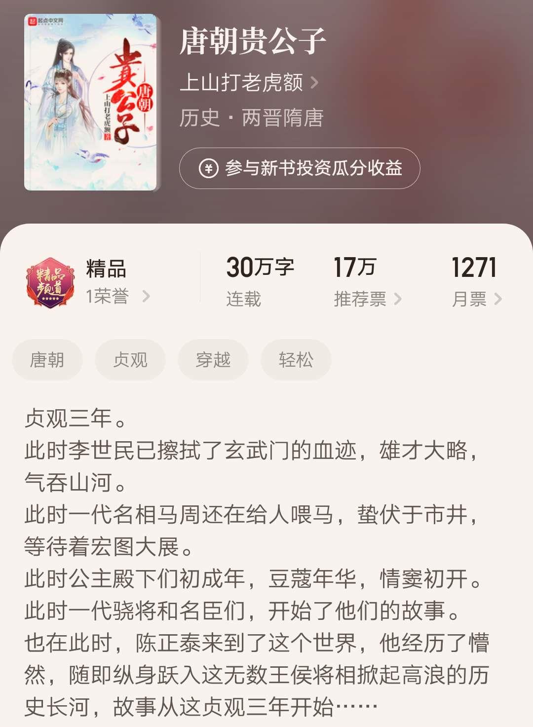 《明朝败家子》让老虎一鸣惊人,半年光阴新书来袭,这是一个从贞观三年开始的故事,金戈铁马,人才辈出,英雄出于草莽没于庙堂,一曲时代凯歌。小说开篇有着前作《明朝败家子》的影子,这大概也是作者的一种创作技巧吧,回昨溯今,新作接受起来就没那么生涩了。