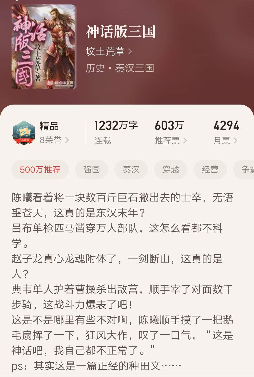 6年4800章1260万字,名次始终稳定在畅销榜前二十,这本小说可真是网文界的异数。小说不负书名,果然将三国历史赋予了浓重的神话色彩,让各种人物职业都拥有了玄幻能力,提升了战斗的精彩程度。而且,小说的世界架构并不只是限定在三国的疆域内,扩大的版图也为故事增加了很多看点和爽感度。目前小说已经进入了番外的阶段,不知道你们是不是在追这本小说呢?