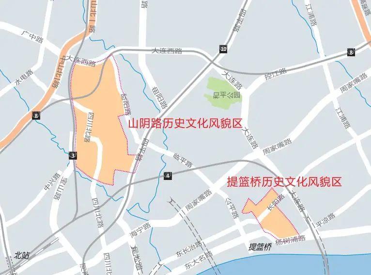 山阴路历史文化风貌区范围为欧阳路—四达路—宝安路—四平路—邢家桥北路—长春支路—长春路—海伦西路—宝山路—东江湾路—大连西路,总面积为129公顷。