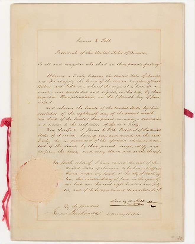 1846年6月15日,英国和美国的代表签署了俄勒冈条约,该条约解决了与英国关于谁控制了俄勒冈领土的长期争端。