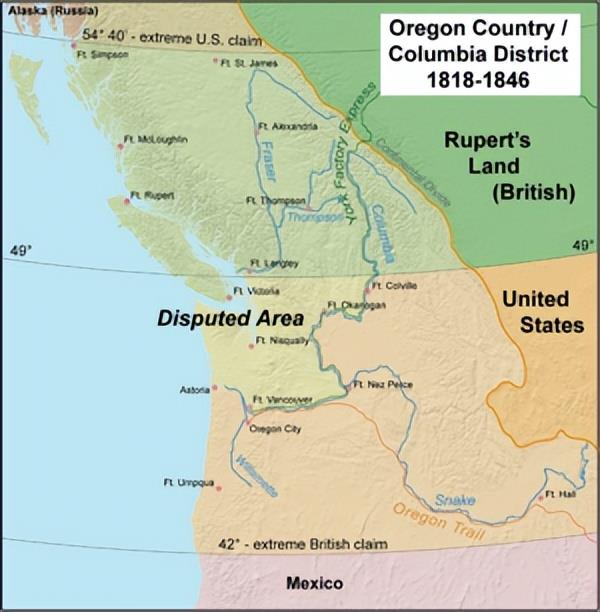 1844年,民主党人詹姆斯·k·波尔克以“54° 40'或战斗”的纲领成功竞选总统,该纲领指的是他希望把如今的不列颠哥伦比亚省和阿尔伯塔省的相当大一部分带入美国。