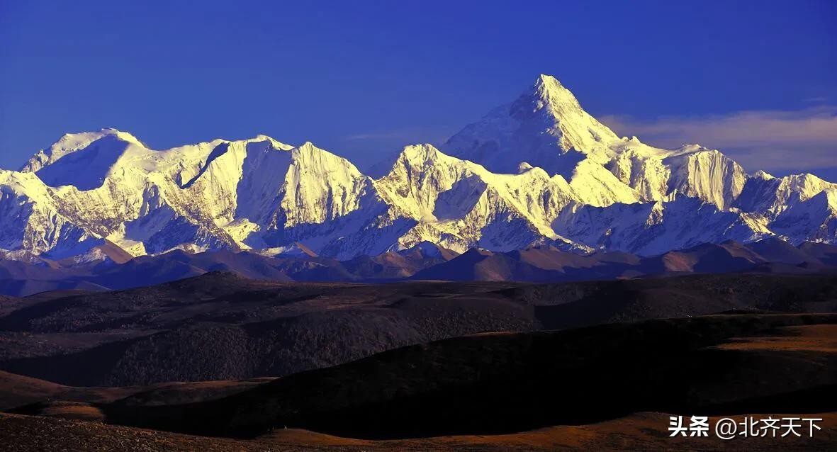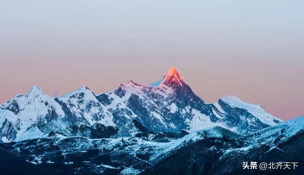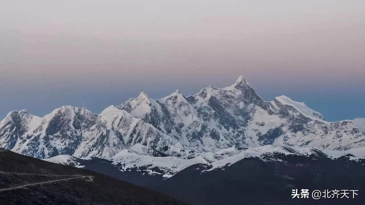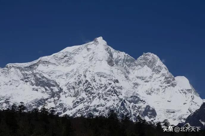 6.贡嘎(Minya Konka),海拔7556米。贡嘎是世界第四十一高峰,中国第十六高峰,完全在中国境内的第六高峰。从世界范围来看,它也是最孤独的一座7000+,距离最近的一座7000+是南迦巴瓦东北峰(7095米),约660公里,而且贡嘎也是最靠东的7000+,同时还是太平洋流域的最高峰。从全国范围看,作为蜀山之王的贡嘎又是距离国境最远的7000+山峰,约有400公里,也是长江流域的最高峰。贡嘎应该是本贴中知名度最高的山峰,一方面是它的海拔,另一方面是因为它是中国7000+山峰中距离人口密集区最近的山峰,在成都市区遇到天气十分晴好时,就能远眺贡嘎。贡嘎从大部分角度眺望都是一座近乎完美的金字塔形角峰,拥有非常规整的东西南北四壁和东北、东南、西南、西北四条山脊。它周围山峰最高的也比它低近七百米(6886米的中山峰),而且它的垂直落差极大,尤其是东侧水平距离最近的大渡河峡谷24公里,但垂直距离在6400米左右。贡嘎的名气还来自于东壁下的海螺沟,这条沟里的冰川上有世界著名的超大冰瀑,高宽都在1100米左右。